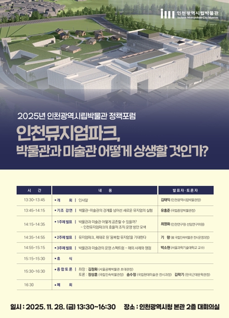 [뉴스앤톡] 인천광역시 시립박물관은 오는 11월 28일 인천시청 대회의실에서 ‘인천뮤지엄파크, 박물관과 미술관 어떻게 상생할 것인가?’를 주제로 정책 포럼을 개최한다고 밝혔다.