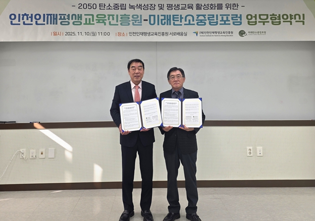 [뉴스앤톡] 2025년 11월 10일, 인천인재평생교육진흥원과 미래탄소중립포럼이 탄소중립 시민교육과 평생교육 활성화를 위한 업무협약(MOU)을 체결했다.
