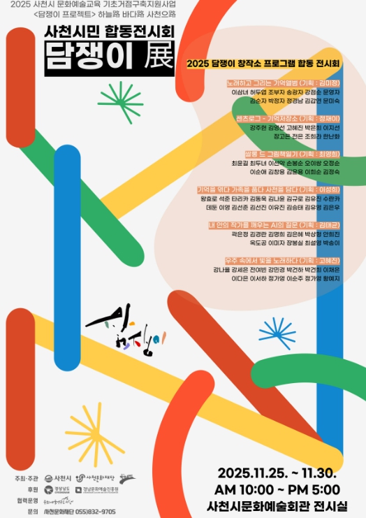 [뉴스앤톡] 사천문화재단은 오는 11월 25일부터 11월 30일까지 2025 사천시문화예술회관 전시실에서 담쟁이 프로젝트 합동 전시회 '담쟁이 展'을 개최한다.