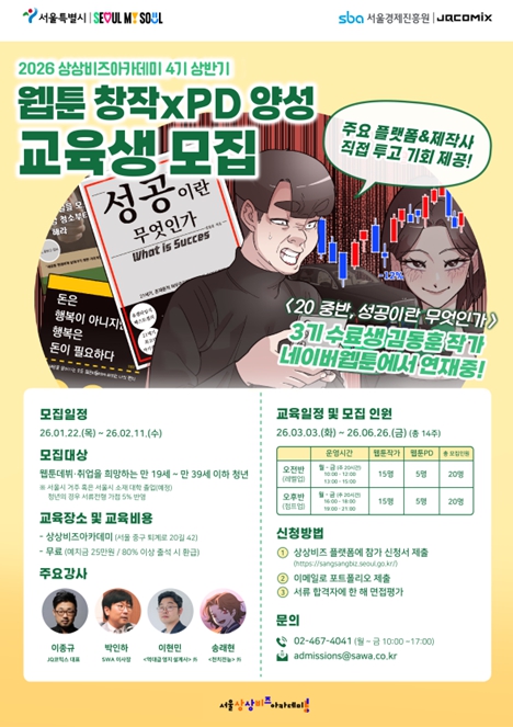 서울시가 운영하는 웹툰·웹소설·애니메이션 분야 전문 교육기관인 ‘상상비즈아카데미’가 2026년 상반기 4기 교육생 모집에 나선다. 실무 중심의 교육을 통해 글로벌 K-콘텐츠의 주인공을 육성한다는 계획이다.