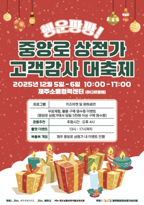 [뉴스앤톡] 제주시는 12월 5일과 6일 오전 10시부터 오후 5시까지 중앙로 상점가 일대에서 ‘행운팡팡! 고객감사 대축제’가 개최된다고 밝혔다.