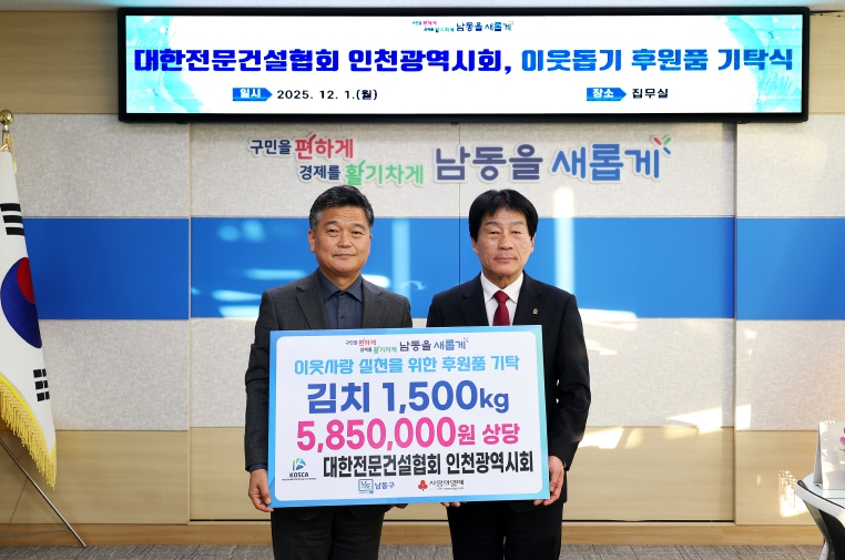 [뉴스앤톡] 인천시 남동구는 대한전문건설협회 인천광역시회(회장 조흥수)에서 취약계층을 위한 김장 김치 1,500kg을 기탁했다고 4일 밝혔다.