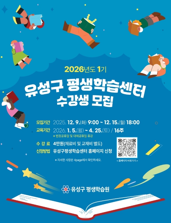 [뉴스앤톡] 대전 유성구는 오는 9일부터 15일까지 구암평생학습센터와 전민평생학습센터에서 운영하는 ‘2026년도 1기 평생학습센터’ 수강생을 모집한다.
