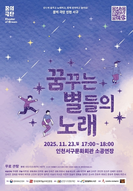 [뉴스앤톡] 인천서구문화재단이 오는 11월 23일 오후 5시, 인천서구문화회관 소공연장에서 ‘2025년 꿈의 극단 인천 서구 정기공연 - 꿈꾸는 별들의 노래’를 개최한다.