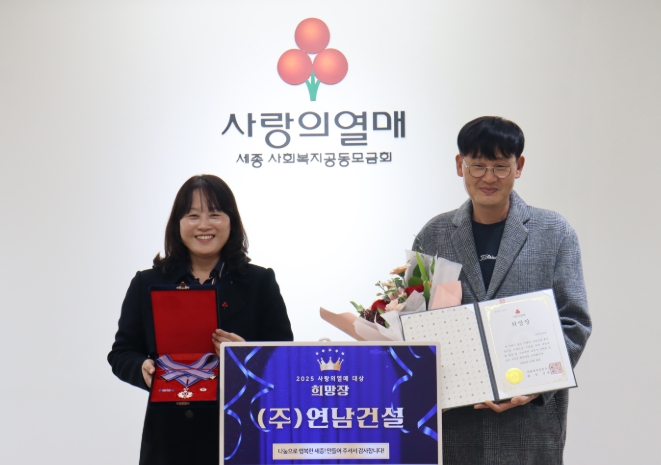 [뉴스앤톡] ㈜연남건설(대표 박성윤)은 사회복지공동모금회가 주최하는 ‘2025년 제12회 사랑의열매 대상’에서 기부분야 ‘희망장’을 수여해 전달식을 가졌다고 세종사회복지공동모금회(회장 박상혁)에서 전했다.