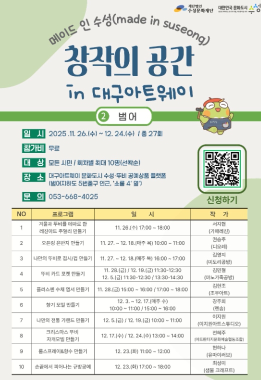 이번 프로그램은 대구아트웨이 내 새롭게 문을 연 ‘수성구 문화도시 홍보관’에서 진행되며, 지역에서 활동 중인 10명의 공방 작가가 참여해 ▲레진아트 ▲가죽공예 ▲향수 만들기 등 다양한 공예 체험을 제공한다.