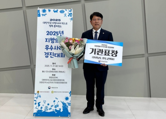 [뉴스앤톡] 완도군의회는 행정안전부가 주관하는 지방의회 우수사례 경진대회에서 2024년에 이어 2025년에도 기관표창을 수상하게 됐다고 밝히며, 이는 도서 지역이라는 완도만의 특성과 군민의 생활 현장을 반영한 생활밀착형 의정활동이 전국적으로 인정받은 결과라고 설명했다.