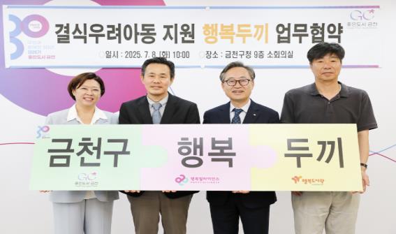 [뉴스앤톡] 금천구는 8일 금천구청 소회의실에서 SK행복나래(주), 행복도시락 사회적협동조합과 ‘결식우려아동 급식 지원을 위한 행복두끼 프로젝트’ 협약을 체결했다고 밝혔다.
