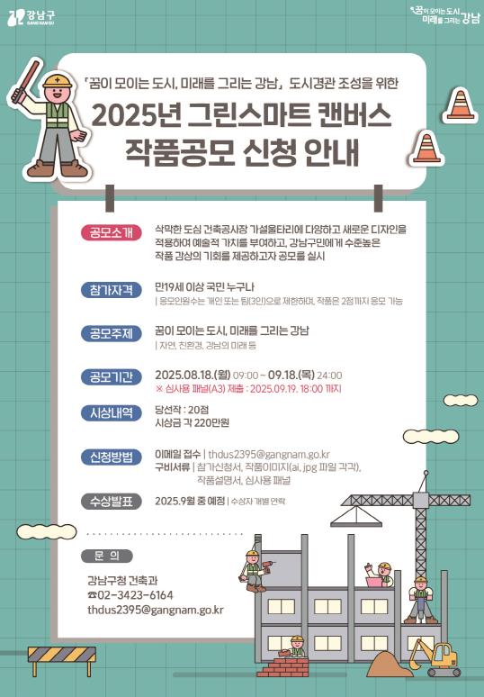 최종 심사를 통해 20점을 선정해 당선작 각 1인(1팀)에게는 220만 원의 상금을 수여한다. 수상작은 강남구 거리 곳곳에 있는 건축공사장 가설울타리 디자인에 활용된다. 자세한 내용은 건축과로 문의하면 된다.