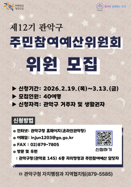 | ▲ 관악구 제12기 주민참여예산위원회 위원 모집 홍보 포스터 |