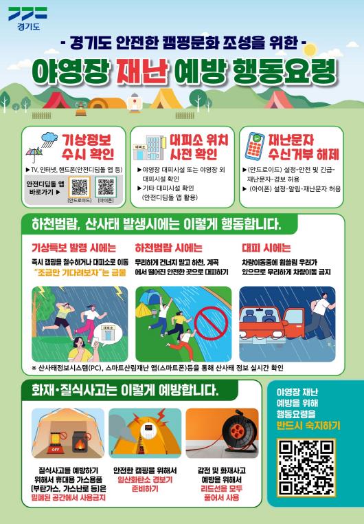 [뉴스앤톡] 경기도는 예측이 어려운 기상상황에 대비해 야영장 이용객의 신속한 대피를 돕기 위한 행동요령 홍보물 10만 8천 부를 제작해 야영장 등에 배포했다고 22일 밝혔다.