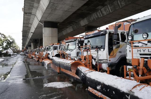 | ▲ 성남 수정구 수질복원센터 하적장에 대기 중인 제설 차량들 |