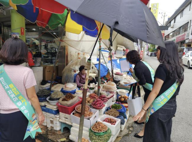 | ▲ 온양온천 전통시장에서 상인에게 농산물 원산지 표시제를 홍보하고 있다. |