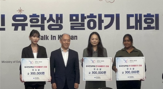 ▲ 'APEC 2025 KOREA' 정상회의 연계행사로 열린‘2025 대학생 모의 APEC 정상회의’ 외국인 유학생 말하기 대회에서 우수상을 차지한 Jiang Yalin양.(사진 왼쪽에서 세 번째) |