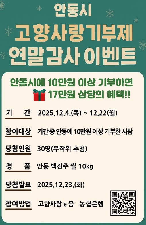 [뉴스앤톡] 안동시는 연말정산 시즌을 맞아, 고향사랑기부제 참여자에게 감사의 뜻을 전하고 기부 문화를 확산하기 위해 12월 22일(월)까지 ‘안동시 고향사랑기부제 연말 감사 이벤트’를 진행한다고 밝혔다.