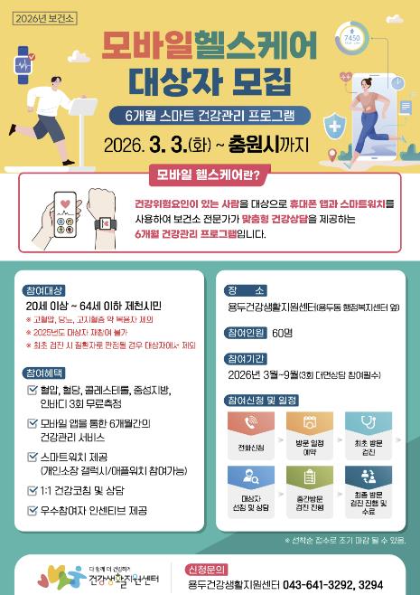 [뉴스앤톡] 제천시보건소는 지역 주민의 자가 건강관리 능력 향상과 만성질환 예방을 위해 용두건강생활지원센터에서 진행하는 ‘2026 모바일 헬스케어 사업’ 신규 참여자 60명을 선착순으로 모집한다.