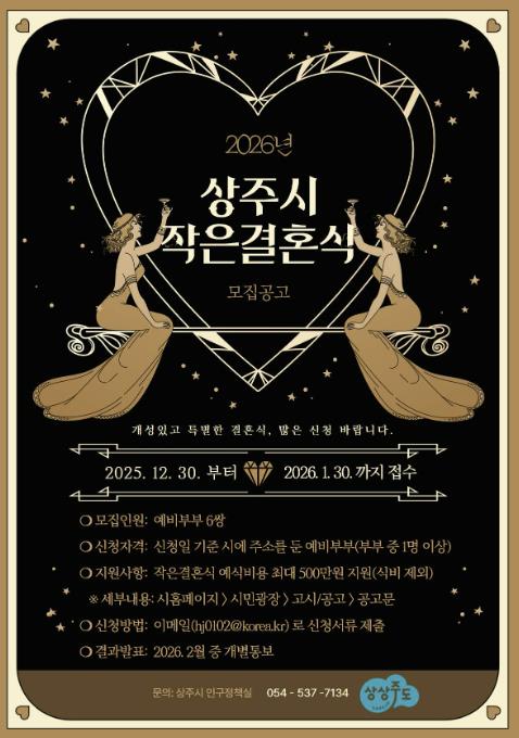 [뉴스앤톡] 상주시는 2026년 작은결혼식 예비부부 6쌍을 2025년 12월 30일부터 2026년 1월 30일까지 모집한다.