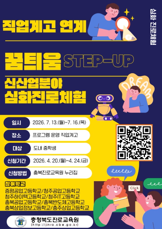 [뉴스앤톡] 충청북도교육청 직속기관 진로교육원은 미래 신산업 분야에 대한 학생들의 진로설계 역량을 높이기 위해 '2026. 꿈틔움 STEP-UP 직업계고 연계 신산업 분야 심화 진로체험'을 운영한다고 밝혔다.