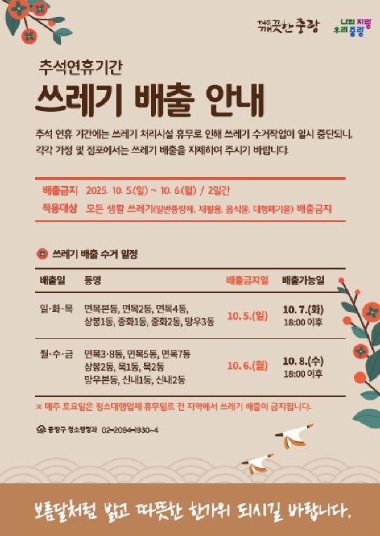 류경기 중랑구청장은 “추석 연휴에도 의료와 환경 두 분야 모두 빈틈없이 준비해 구민들이 안심하고 명절을 보낼 수 있도록 하겠다”며, “주민 여러분께서도 쓰레기 배출 일정을 잘 지켜주시고, 응급상황 발생 시 가까운 지정 의료기관을 이용해 주시길 바란다”고 당부했다.