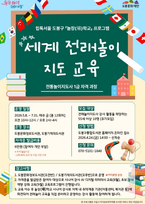 세계 전래놀이 지도 교육은 도봉문화정보도서관(오전반), 도봉기적의도서관(오후반)에서 운영되며 신청은 4월 24일 오후 2시부터 도봉구통합도서관 누리집에서 가능하다.