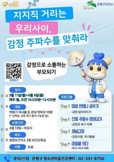 프로그램은 5월 11일부터 6월 8일까지 매주 월요일 진행되며, 은평구 거주 학부모를 대상으로 한다. 4회기 전 일정 참여가 가능한 경우에 한해 선착순 15명을 모집한다.