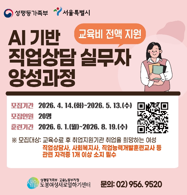 [뉴스앤톡] 서울 도봉구가 도봉여성센터에서 ‘AI 기반 직업상담 실무자 양성과정’을 운영한다고 밝혔다. 대상은 직업상담사, 사회복지사, 직업능력개발훈련교사 등의 자격증을 소지하고, 취업지원 분야로 취업을 희망하는 여성 구직자다.