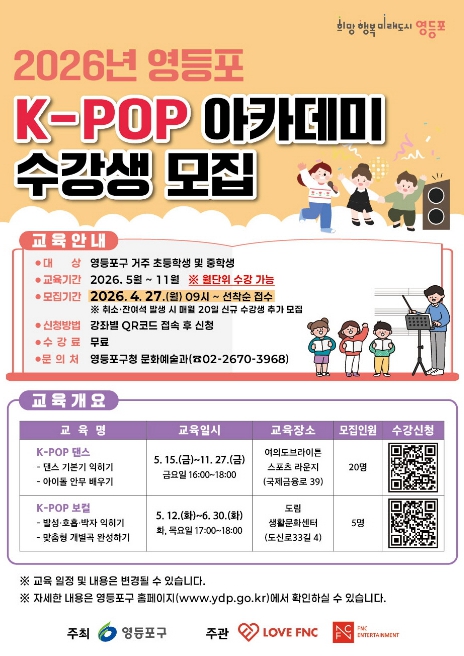 이번 프로그램은 영등포구와 FNC엔터테인먼트의 비영리 공익재단인 ‘LOVE FNC’가 공동 기획한 K-컬처 기반 문화예술 교육이다. 청소년들이 안무 습득과 보컬 훈련을 통해 자기표현 능력을 키우고 정서적 성취감을 얻을 수 있도록 구성했다.