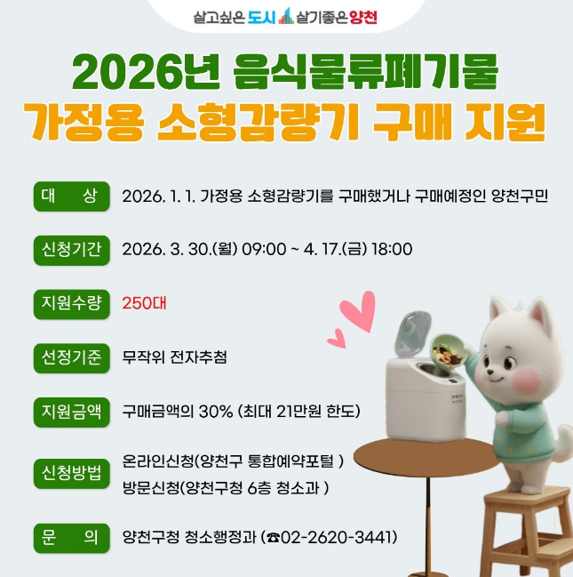 신청 대상은 공고일(2026. 3. 9.) 기준 양천구에 주민등록이 되어 있고, 2026년 1월 1일 이후 가정용 음식물쓰레기 소형 감량기를 구매했거나 구매 예정인 구민이다.