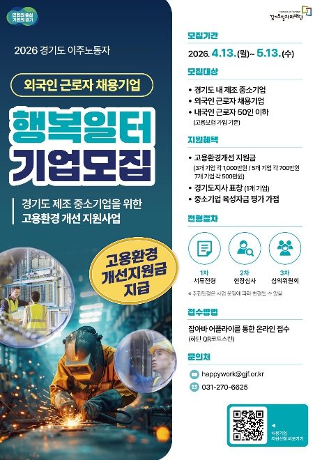 [뉴스앤톡] 경기도와 경기도일자리재단은 도내 외국인 근로자를 고용한 중소 제조기업을 대상으로 ‘2026년 경기도 이주노동자 행복일터 선정사업’ 참여기업을 모집한다고 20일 밝혔다.
