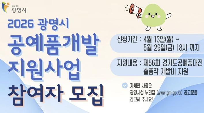 최혜민 광명시장 권한대행(부시장)은 “이번 사업으로 지역 공예인들의 창작 의욕을 높이고 우수한 작품이 발굴되길 바란다”며 “앞으로도 공예산업이 지역경제의 한 축으로 성장할 수 있도록 다양한 지원을 지속해 나가겠다”고 밝혔다.