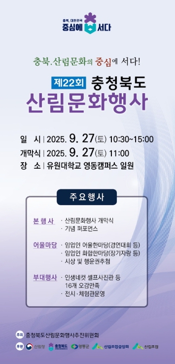 [뉴스앤톡] 제22회 충청북도 산림문화행사가 오는 27일 오전 10시 30분부터 영동군 유원대학교 영동캠퍼스 일원(영동읍 대학로 310)에서 열린다.