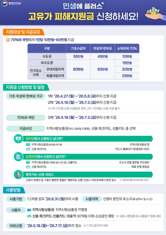 군 관계자는 “고유가로 어려움을 겪는 군민들에게 실질적인 도움이 되길 바란다”며 “지급 초기 혼잡이 예상되는 만큼 사전 안내를 참고해 신청에 차질이 없도록 준비해 달라”고 당부했다.
