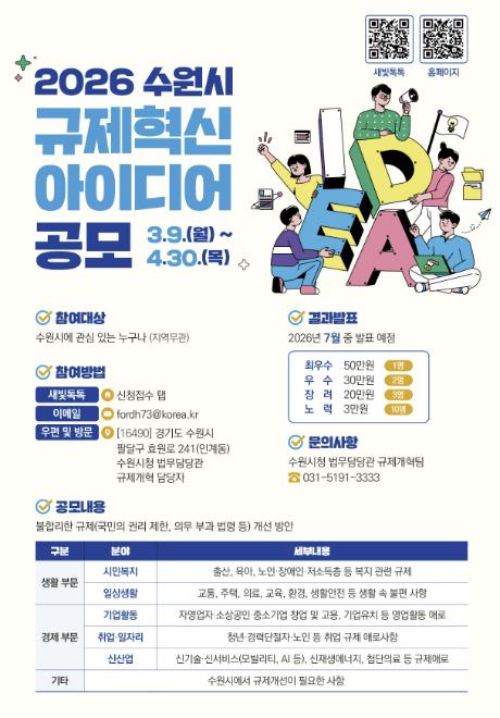 [뉴스앤톡] 수원특례시가 9일부터 4월 30일까지 ‘2026 규제혁신 아이디어’를 공모한다.