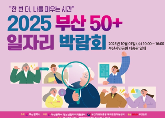 [뉴스앤톡] 부산시는 내일(10월 1일) 오전 10시부터 오후 4시까지 부산시민공원 다솜관 일대에서 신중년 세대의 인생 2막 도전을 지원하는 '2025년 부산 50플러스(+)일자리 박람회'를 개최한다고 밝혔다.