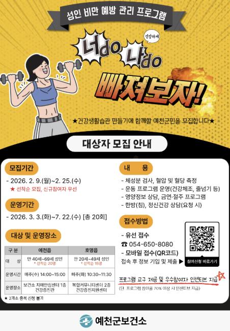 [뉴스앤톡] 예천군은 성인 비만 예방과 건강한 생활 습관 형성을 위해 ‘2026년 성인 비만 예방 관리 프로그램’ 참여 대상자를 9일부터 25일까지 선착순으로 모집한다.