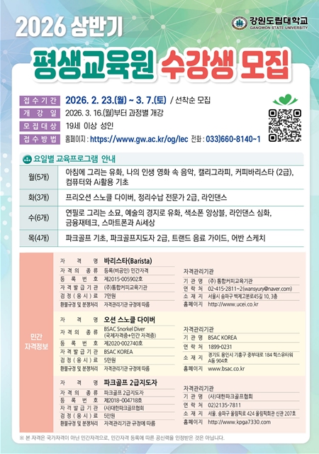 | ▲ 강원도립대학교 평생교육원, 2026년 상반기 수강생 모집 |