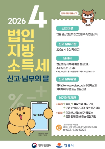 [뉴스앤톡] 강릉시는 ‘2026년 4월 법인지방소득세 신고·납부의 달’을 맞아 12월 결산법인의 2025년 귀속 법인소득에 대한 법인지방소득세를 오는 4월 30일까지 신고·납부해야 한다고 밝혔다.