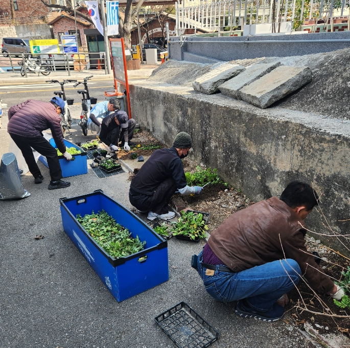 | ▲ 성북동 주민센터와 지역 주민들이 3월 31일 성북동 일대에서 봄맞이 꽃 식재 활동을 진행하며 마을 환경 개선에 참여하고 있다. |
