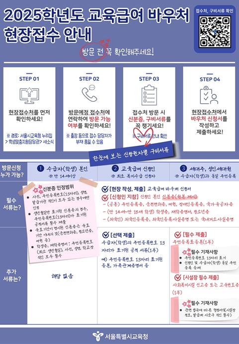 [뉴스앤톡] 서울특별시교육청은 2025년 12월 2일부터 12월 12일까지, 2025학년도 교육급여 바우처 미신청자 중 온라인 신청이 어려운 대상을 위해 한시적 현장 접수를 운영한다고 밝혔다.