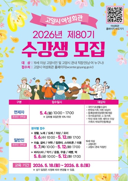 [뉴스앤톡] 고양특례시 여성회관은 오는 5월 4일부터 12일까지 2026년 제80기 정규강좌 수강생을 모집한다.