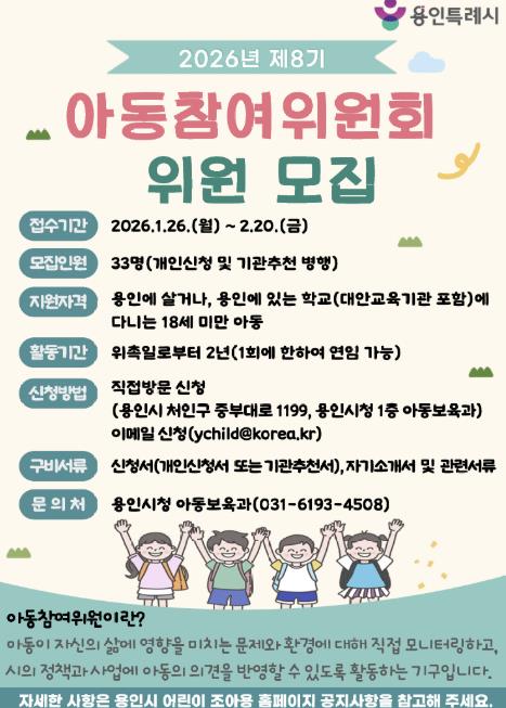 [뉴스앤톡] 용인특례시는 1월 26일부터 2월 20일까지 아동정책 수립 과정에 적접 참여할 ‘제8기 아동참여위원회‘ 위원 33명을 모집한다.