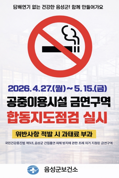 [뉴스앤톡] 음성군보건소는 오는 27일부터 5월 15일까지 음성군 소재 공중이용시설 금연구역 점검과 함께 금연구역 내 흡연행위 단속을 강화한다고 밝혔다.
