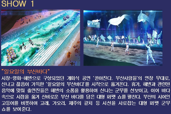 '쇼(Show) 1'에서는 '일요일의 부산바다'를 주제로 군무와 대형 '퍼펫 쇼(인형극)'를 선보인다.