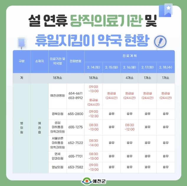 | ▲ 예천군, 설 연휴 당직 의료기관 및 휴일 지킴이 약국 운영 |