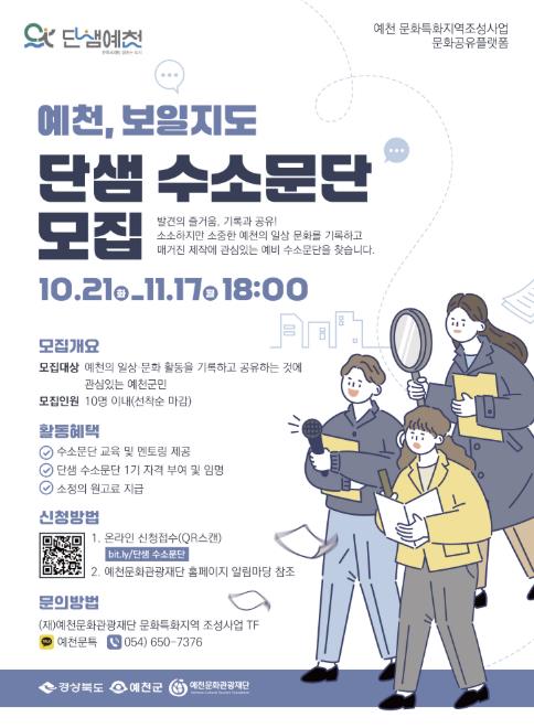 [뉴스앤톡] 예천군과 (재)예천문화관광재단은 예천 문화특화지역 조성사업의 일환으로 추진하는 ‘예천, 보일지도’의 ‘단샘 수소문단’ 프로그램 참여자를 11월 17일까지 모집한다.