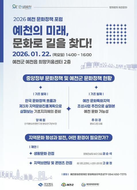 또한 권순석 대표(문화컨설팅 바라)와 고윤정 전 센터장(영도문화도시센터)이 생활문화 및 도시 브랜딩 관점의 제언을 더할 예정이며, 이날 포럼에는 군청을 비롯한 군의회, 유관기관에서도 참석해 예천에 필요한 문화 환경 조성 방안을 함께 모색할 예정이다.