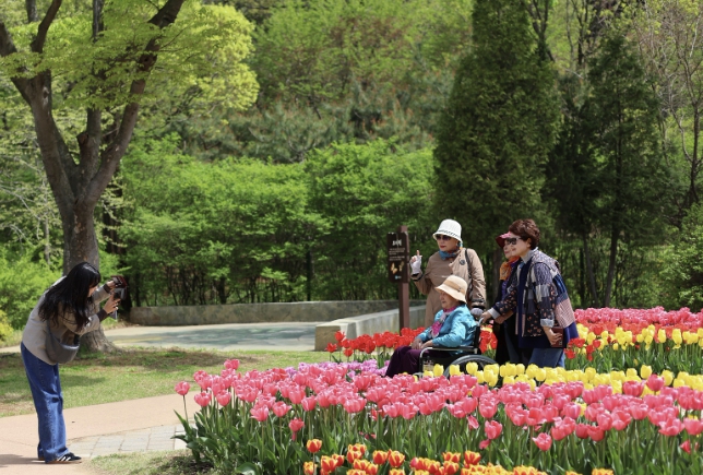 | ▲ 부천자연생태공원에 활짝 핀 튤립 사이로 시민들이 사진을 찍고 있다. |
