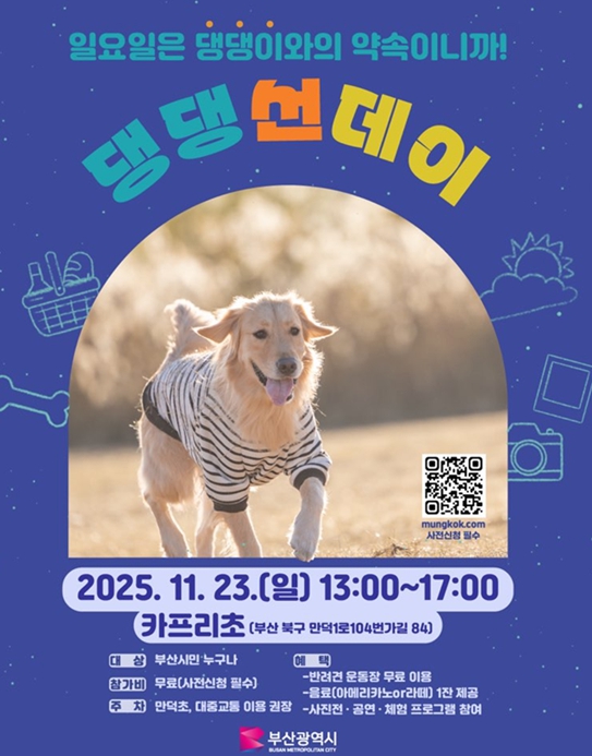 [뉴스앤톡] 부산시는 오는 11월 23일 오후 1시부터 5시까지 카프리초(북구 만덕동 소재) 내 반려견 운동장에서 '댕댕 선데이(반려동물 동반 피크닉 체험 행사)'를 개최한다고 밝혔다.