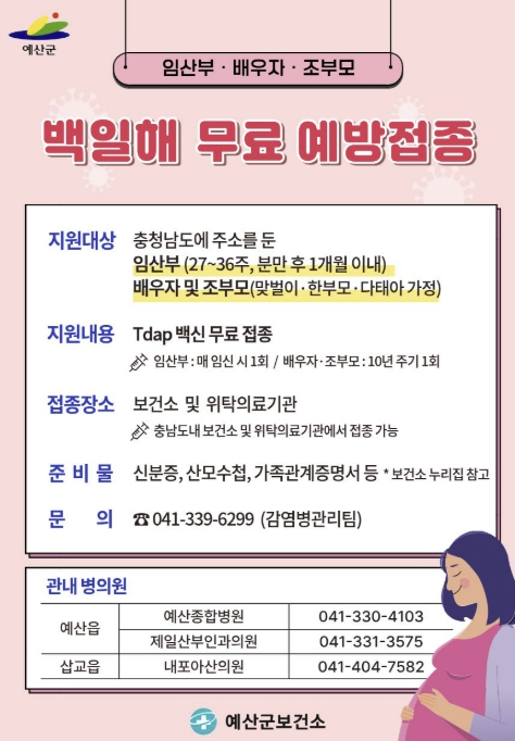 보건소 관계자는 “백일해는 영유아에게 치명적일 수 있어 가족의 선제적 접종이 무엇보다 중요하다”며 “지참서류 등 자세한 사항은 보건소 누리집 또는 감염병관리팀(041-339-6299)으로 문의하면 안내받을 수 있다”고 말했다.