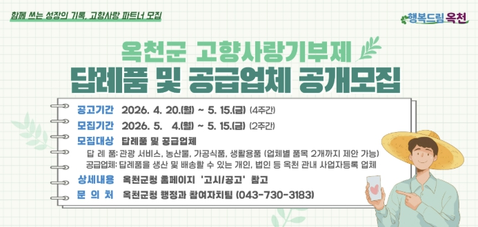 접수된 신청서는 서류 평가와 답례품 선정위원회의 심의를 거쳐 최종 선정되며, 선정된 업체는 옥천군과 공급·운영 협약을 체결하게 된다.